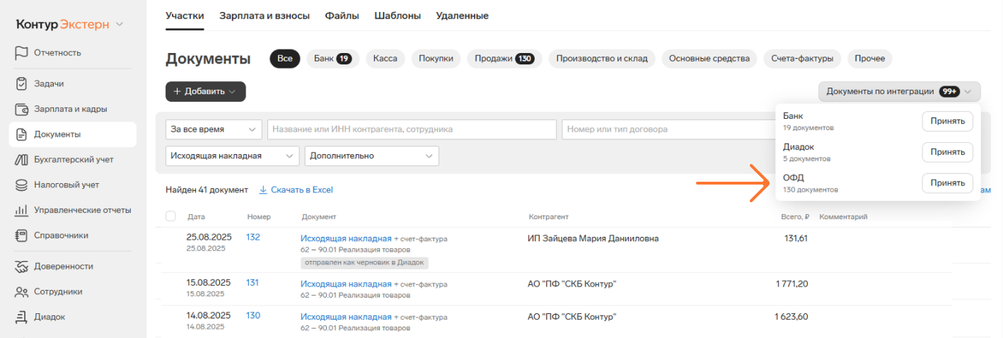 1. На главной странице Экстерна выберите «Учет» → Документы» → «Все» или «Документы» → Продажи» и нажмите «Документы по интеграции» → «Принять».